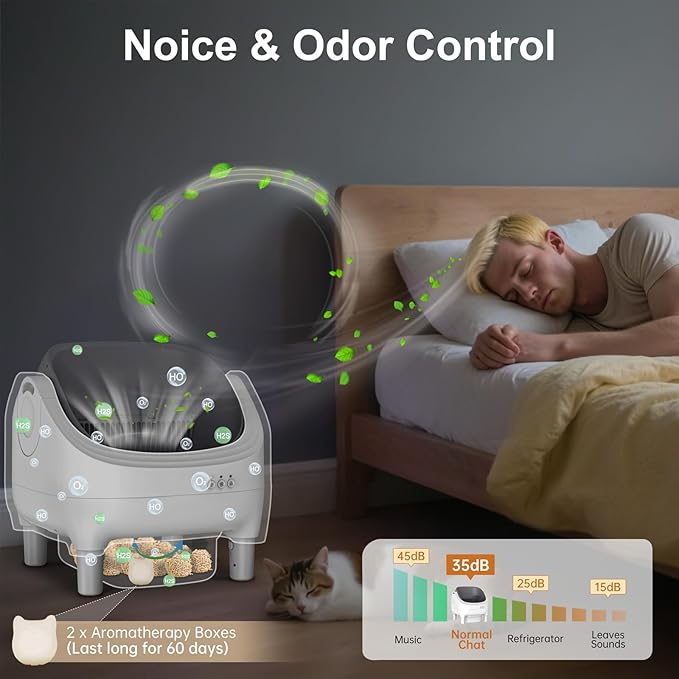 - Accessories & Odor Control – Includes 3 rolls of garbage bags (60 pcs) and a 10L bin in this large litter box, holding waste for 10–15 days without emptying. Two aromatherapy boxes work with the litter robot to keep kitty litter box smelling fresh for 60 days.