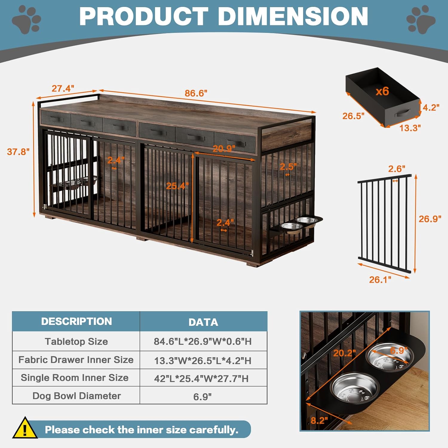 86.6Inch Large Double Dog Crate Furniture,Heavy Duty Metal Frame Dog Crate Kennel with Adjustable Feeder Bowls and Removable Divider&Drawers,Chew-Resistant Dog Kennel for 2 Dogs Indoor