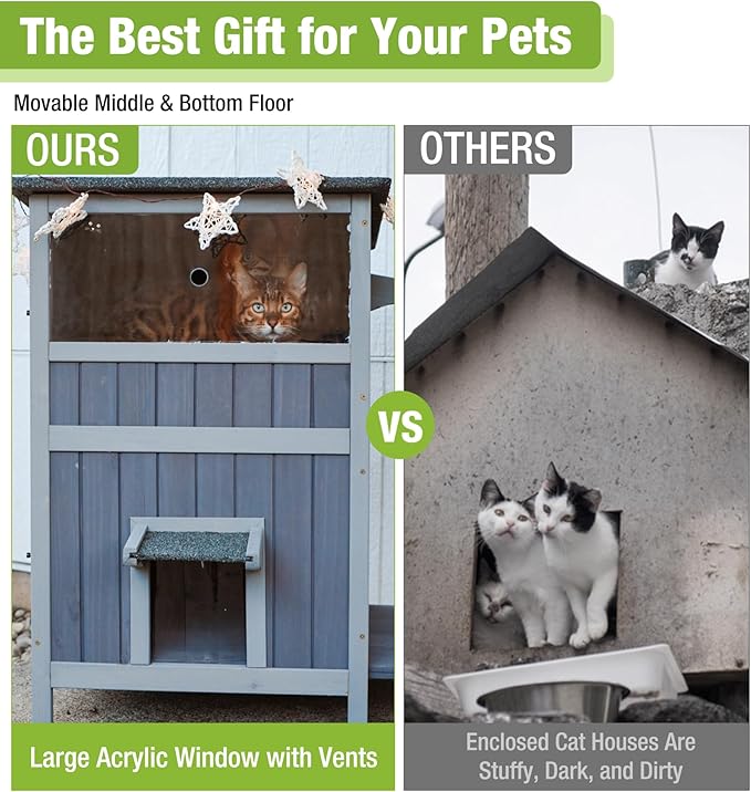 - ππππππππππ & ππππππππ πππ πππππ ππππππ - With a large acrylic window (plus vents) and dual openable side doors, this cat house & condo ensures airflow and easy access. The middle hole connects two floors for free jumpingβideal for feral cat house outdoor privacy and activity