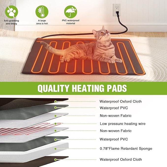 - Safety Design: The heating pad has anti-grabbing and biting features, and the wires are designed to prevent pets from chewing, ensuring the safety of the pets. Additionally, the heating pad has a thermostatic function to avoid overheating, providing the most comfortable temperature for pets.