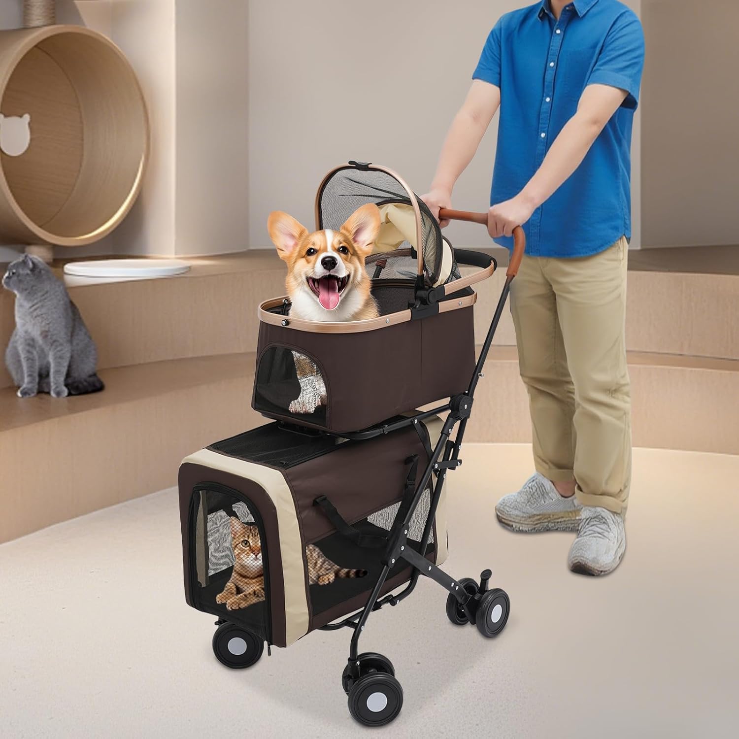 Foldable Pet Stroller for Small & Medium Dogs, Double Dog & Cat Stroller with 3-in-1 Travel System, Detachable Pet Carrier with Wheels for Cats and Dogs up to 77 lbs, Coffee Color