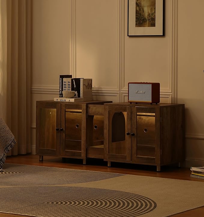 - 【Dual-Section Litter Box Enclosure】Designed for multi-cat households, this innovative enclosure features two separate litter compartments with a central entryway,allowing two cats to use it simultaneously without crowding.The smart divided layout ensures hygiene and reduces territorial stress.