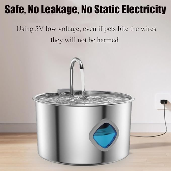 - Ultra-Quiet & Splash - Free Operation: With a whisper-quiet pump (<25dB) and a gentle water flow, the Pawira Water Fountain keeps your home peaceful, allowing your furry friend to enjoy a peaceful drink without any disturbances while preventing messy spills. The deep stainless steel basin is designed to minimize splashing