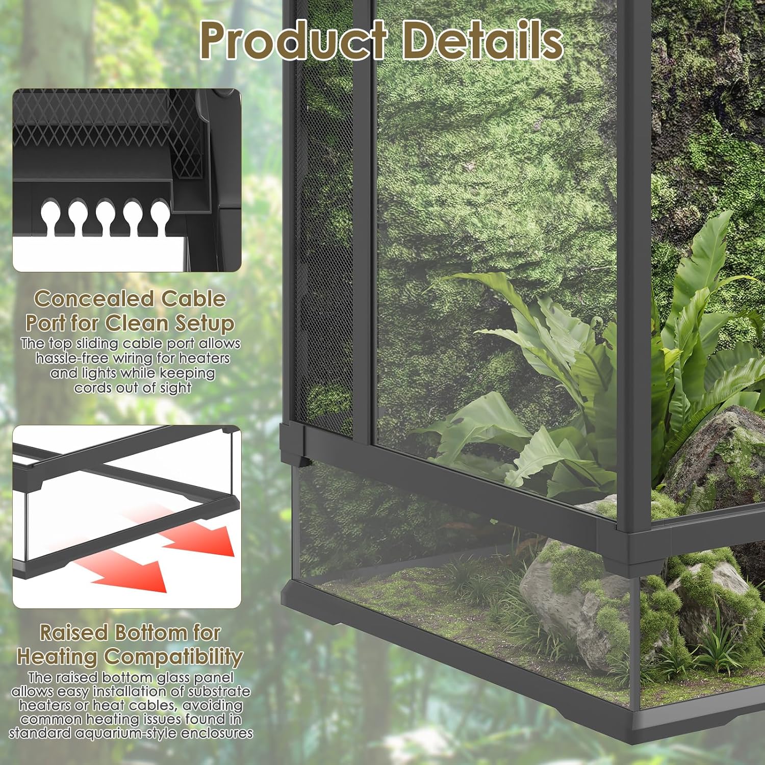 - Heating-Compatible Raised Base & Cable Port: This reptile tank features a raised base compatible with heating mats and a top sliding cable port, allowing easy wiring for heaters or lights while keeping cords hidden